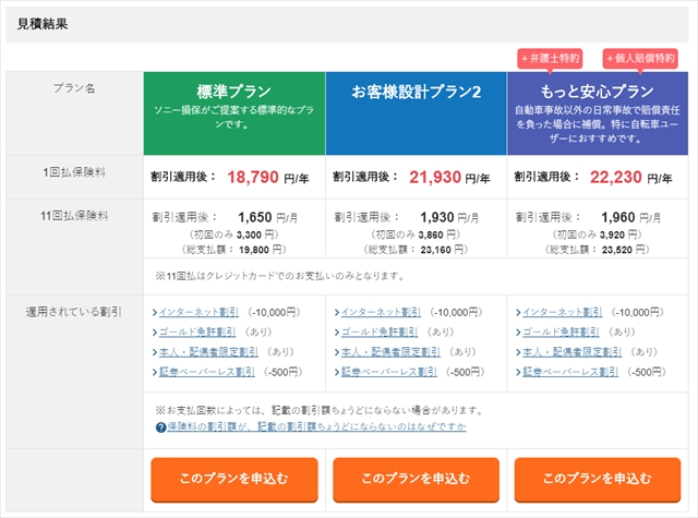 ソニー損保の自動車保険で見積もりをしてみて 標準プラン、お客様設計プラン2、もっと安心プランが表示されています。